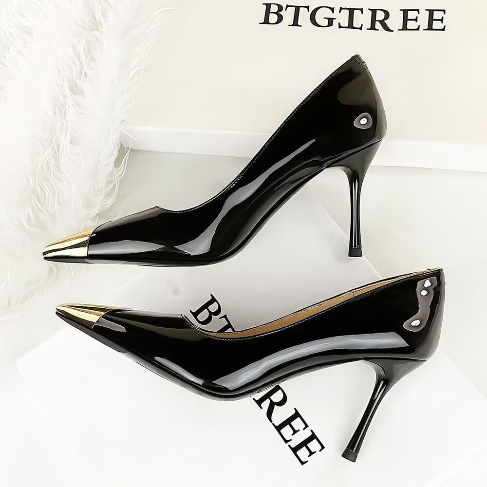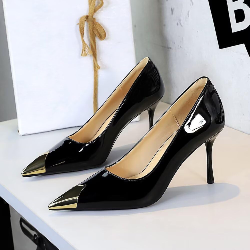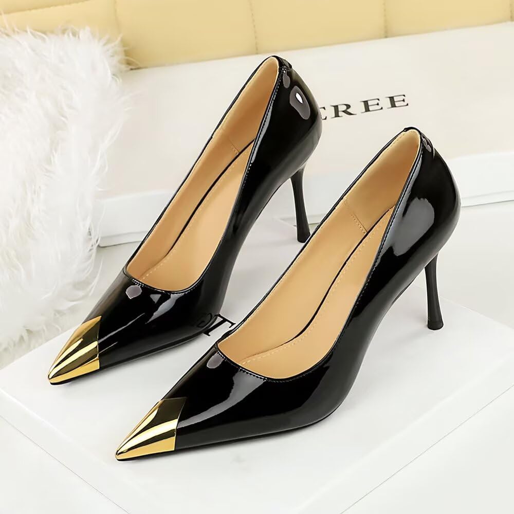 Bold and sophisticated, these black patent leather stiletto pumps with gold-tipped toes are designed to make a statement. Perfect for women who love elegance with a daring edge, they combine timeless style with a modern metallic accent. Design & Craftsmanship Sleek pointed toe silhouette elongates the legs for a graceful profile. Striking gold metal toe cap adds a touch of glamour and luxury. Glossy patent leather finish for a polished, high-shine look. Slim stiletto heel for an ultra-feminine and confident stance. Comfort & Functionality Lightly padded insole offers comfort even with the high heel. Durable outsole ensures reliable grip and stability. Designed with a secure slip-on style for easy wear. Structured build keeps the shape refined and elegant with every step. Color & Style Classic black patent finish that pairs effortlessly with any outfit. Gold-tipped toe detail enhances the design with a luxurious accent. Sleek, elegant, and bold—a perfect blend of minimalism and statement design. Perfect For Every Occasion Formal Events: Ideal for galas, banquets, and evening receptions. Work & Meetings: Adds authority and sophistication to professional attire. Parties & Night Out: The glossy finish and gold detail make them stand out under lights. Special Occasions: A perfect choice when you want to make a refined impression. Why You’ll Love It These black stiletto pumps are more than just heels—they’re a symbol of power and elegance. The combination of glossy patent leather, pointed toe design, and gold-tipped detail ensures you’ll turn heads wherever you go.