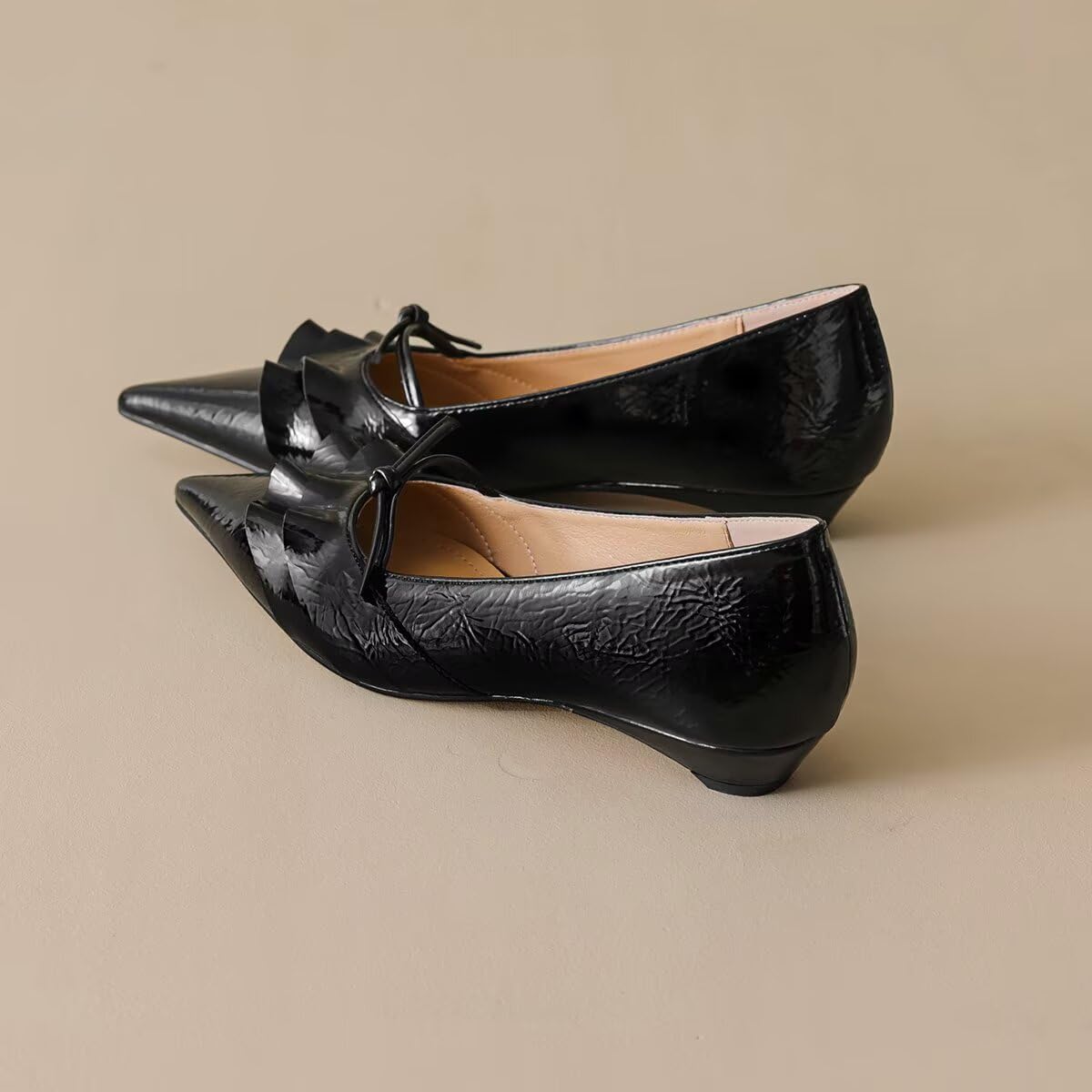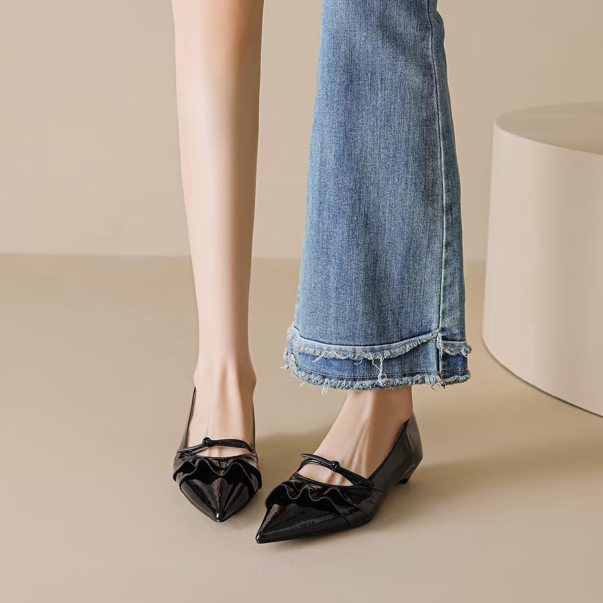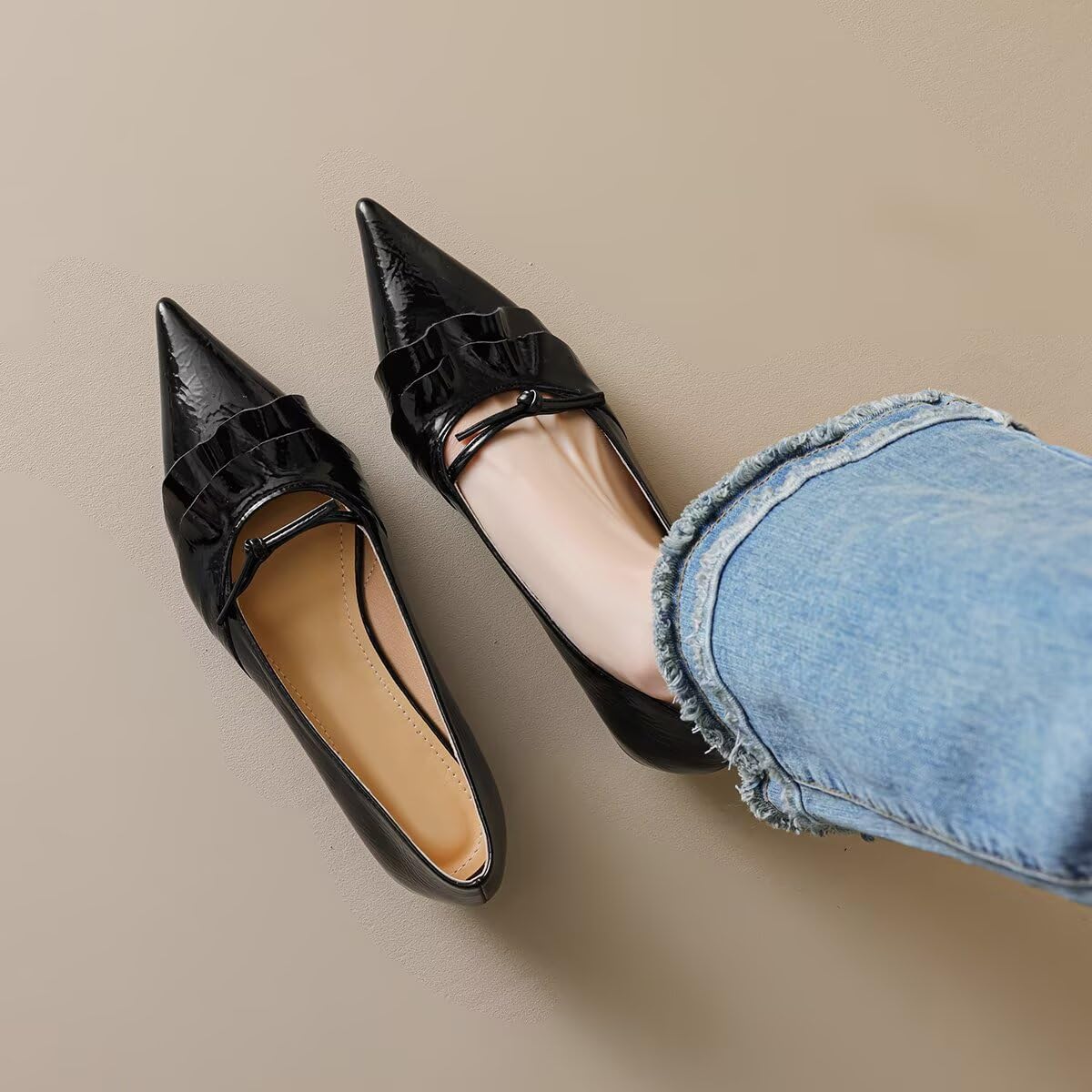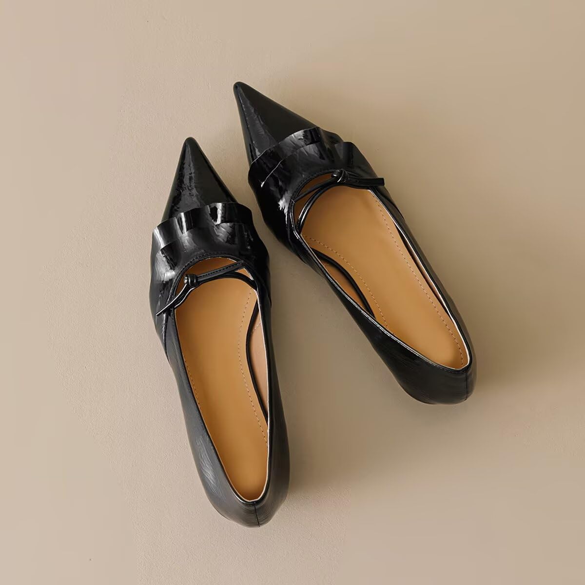 Sleek and contemporary, these black pointed toe flats bring together modern minimalism and feminine refinement. Featuring a glossy finish and slim strap across the instep, they are versatile shoes that can elevate both casual and professional looks. Design & Craftsmanship Sharp pointed toe design for a chic and elongating effect. Glossy black patent finish adds elegance and a polished touch. Slim strap detail across the instep, secured with a delicate buckle. Low-profile silhouette with a modern, streamlined structure. Smooth edges and refined stitching highlight quality craftsmanship. Comfort & Functionality Lightly cushioned insole ensures comfort throughout the day. Flat sole construction offers stability and ease of movement. Breathable lining enhances wearability even during long hours. Slip-on style with strap closure for practicality and a secure fit. Color & Style Classic glossy black for maximum versatility. Minimalist design balanced with strap detail for a modern twist. Perfect for women who value both simplicity and sophistication. Perfect For Every Occasion Work & Office: A smart choice for pairing with trousers, dresses, or skirts. Casual Outings: Adds polish to jeans, casual pants, or flowy skirts. Evening Events: Suitable for semi-formal occasions where understated elegance is key. Travel & Daily Wear: Comfortable yet stylish, making them easy to pair on the go. Why You’ll Love It These black patent strap flats are timeless wardrobe staples that blend elegance with practicality. Their versatile design makes them easy to style, offering a refined touch for both everyday wear and special moments.