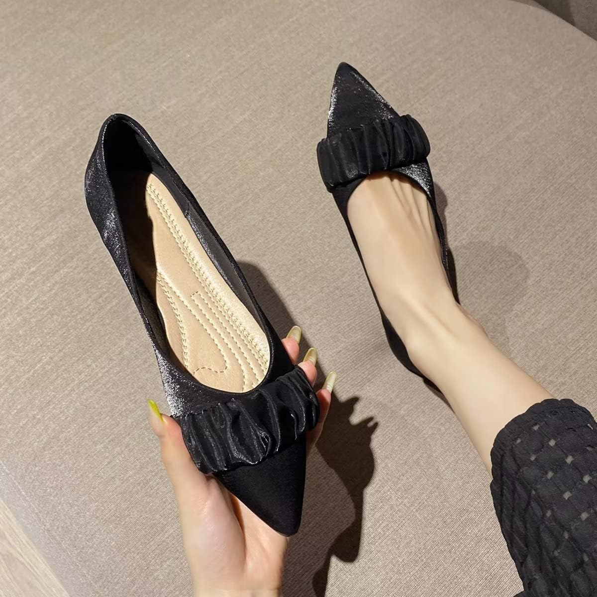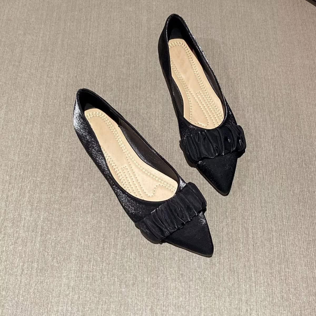 These black pointed toe flats offer a blend of simplicity and sophistication. The pleated detail gives them a unique charm, while the classic black design makes them versatile essentials for any wardrobe.