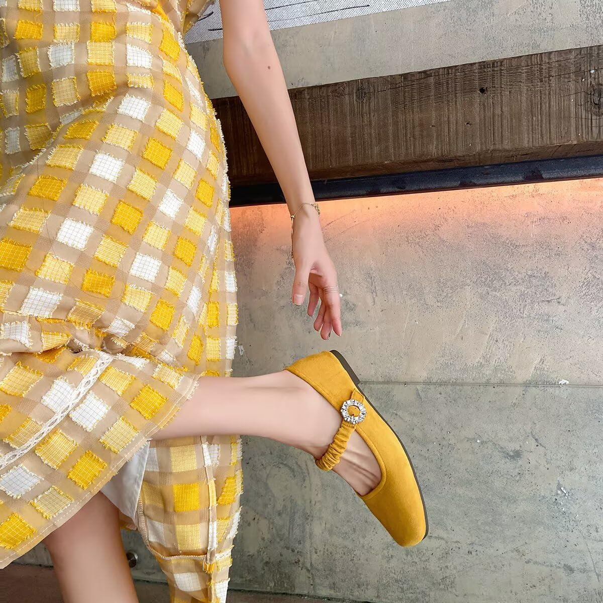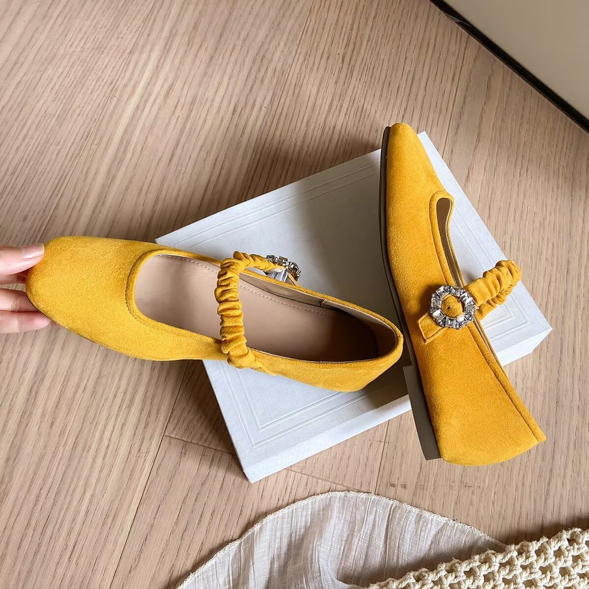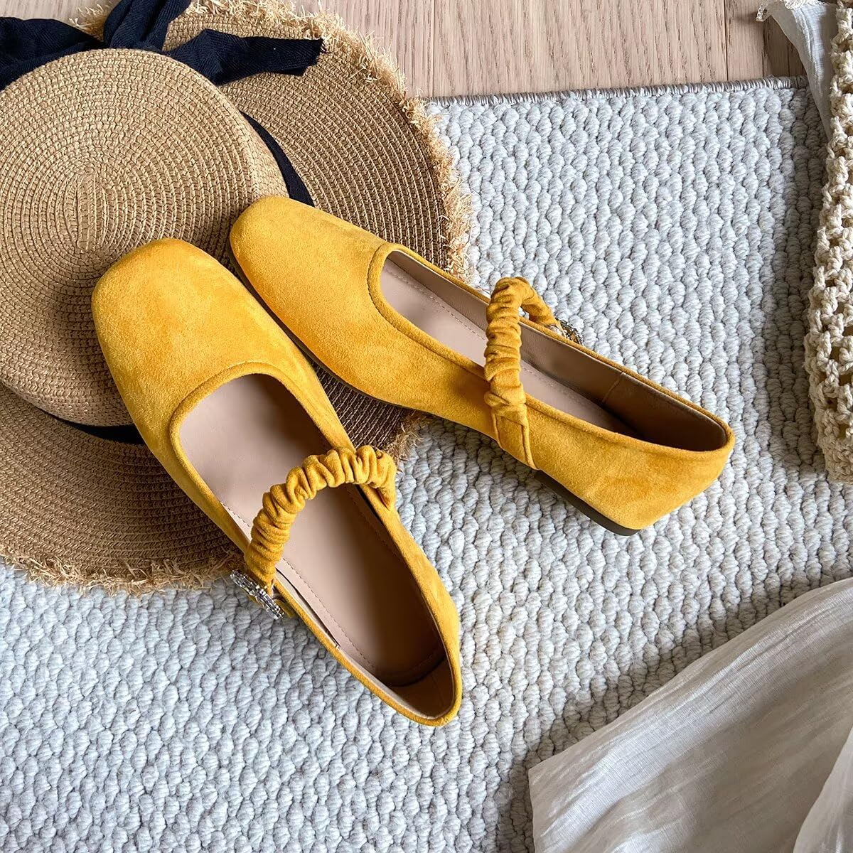 These mustard yellow Mary Jane flats are more than just shoes—they’re a statement piece. The combination of a bold color, ruched strap, and crystal embellishment makes them versatile enough to wear from casual days to special occasions, always keeping you comfortable and stylish.