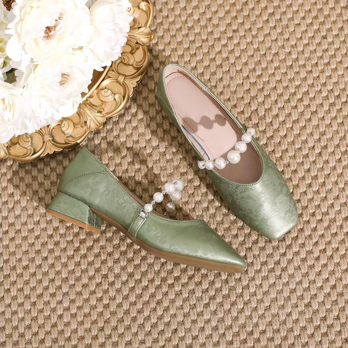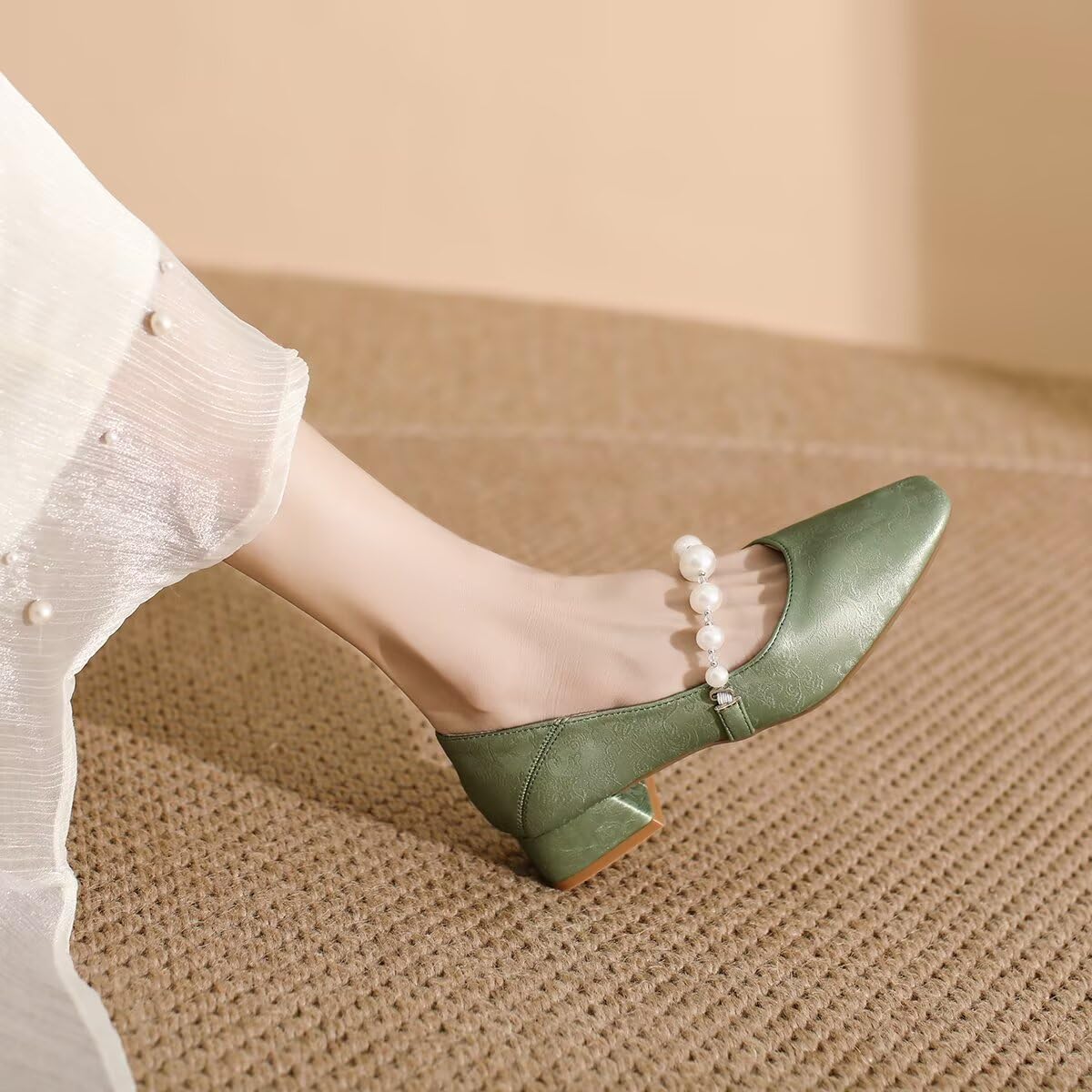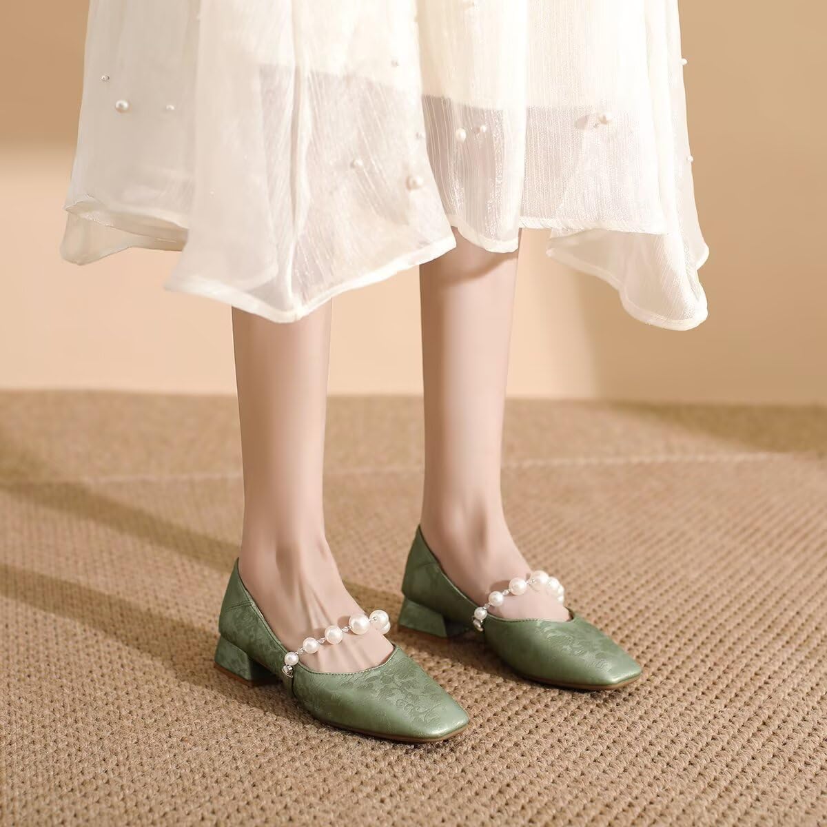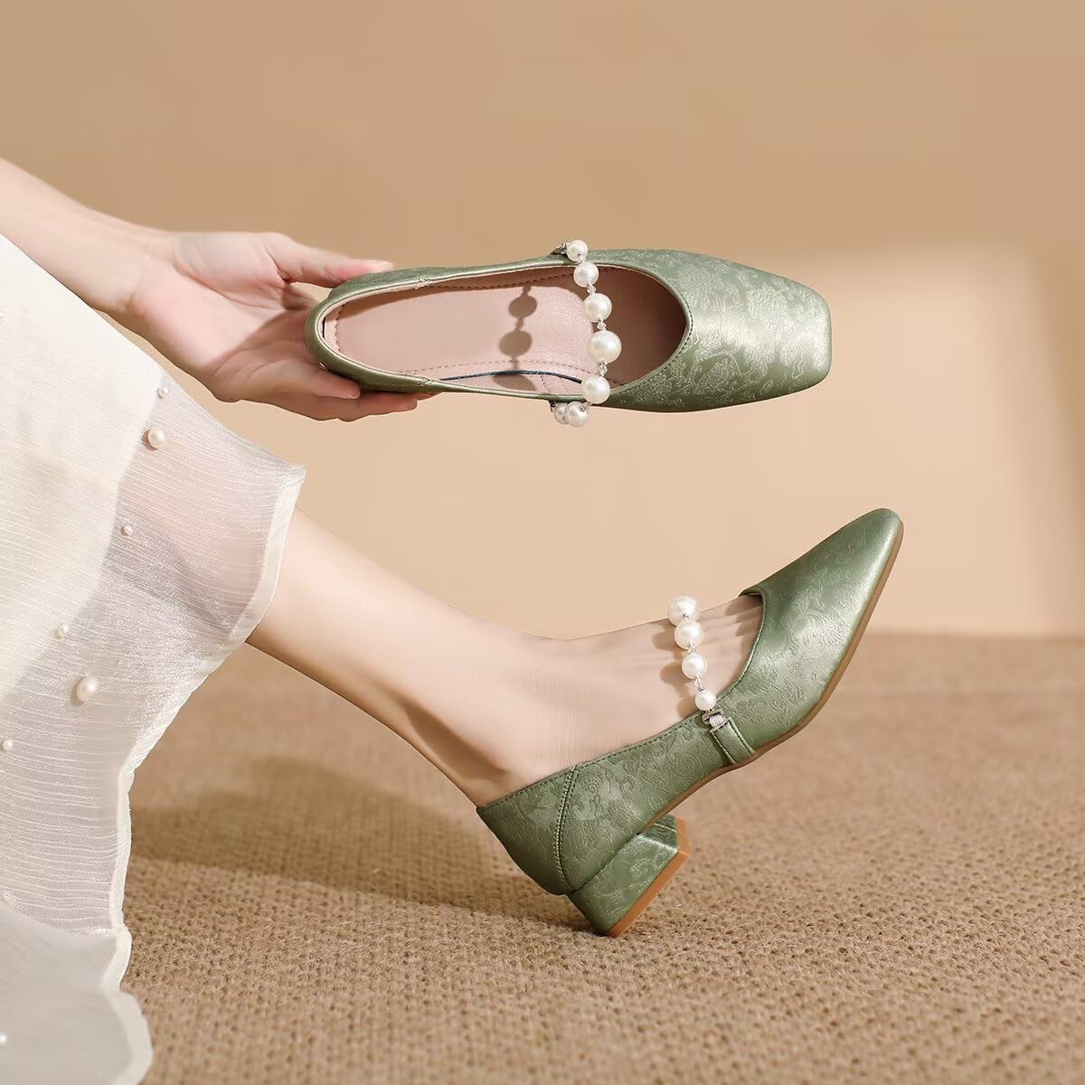 Elegant and timeless, these sage green pumps bring a vintage-inspired charm with their jacquard fabric and delicate pearl strap. Designed for both comfort and sophistication, they are the perfect balance of grace and functionality.