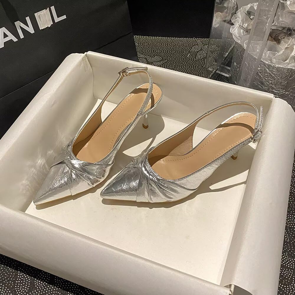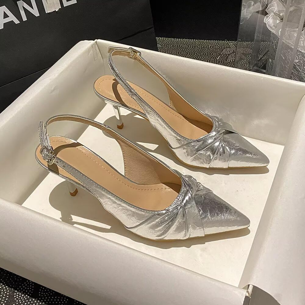 Shimmering with sophistication, these silver slingback kitten heels add an instant touch of glamour to any look. With a pointed toe and elegant low heel, they balance style and comfort effortlessly.